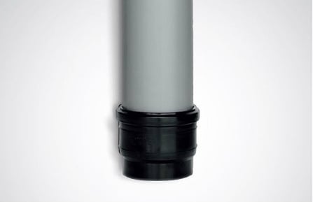 Tutaj mamy do czynienia z odwrotną sytuacją niż w poprzednim przypadku. Do kielicha (50 lub 75 mm) rury PVC lub SiTech+ (na zdjęciu w kolorze czarnym) należy włożyć bosy koniec rury Wavin AS. Funkcję złączki przejściowej pełni dołącznik PVC HT z uszczelką manszetową o odpowiedniej średnicy (50 lub 75 mm).