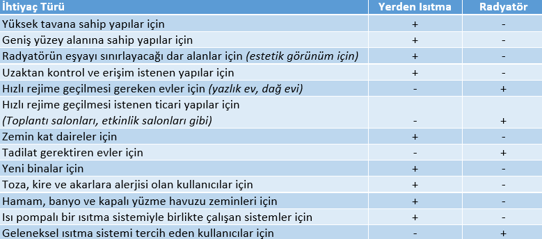 Isıtma sistem tercihinde, ihtiyaca göre avantajlarını belirleyip, tercih yapmak gerekmektedir. Yukarıdaki tabloyu bu konuda size yardımcı olması için hazırladık. Ayrıca sistem tercihinde ilk yatırım maliyeti, işletme maliyeti, bakım maliyeti göz önüne alınmalıdır.